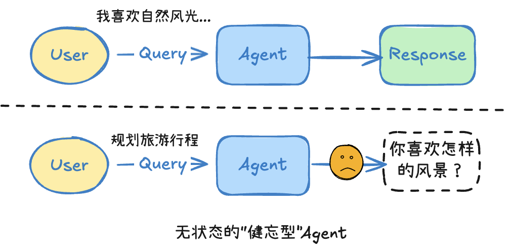 这种“短记性”严重影响AI Agent的体验:你不可能每次使用旅游规划助手,都强调你喜欢自然风光而不是人文景观: