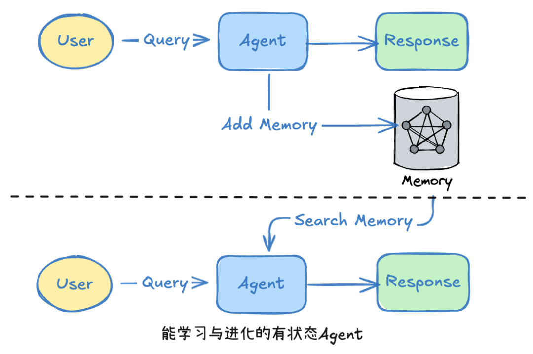在真实的对话Agent中,这些调用也可能由LLM框架自动触发:任务结束后存储记忆,新任务开始时自动检索并注入上下文。