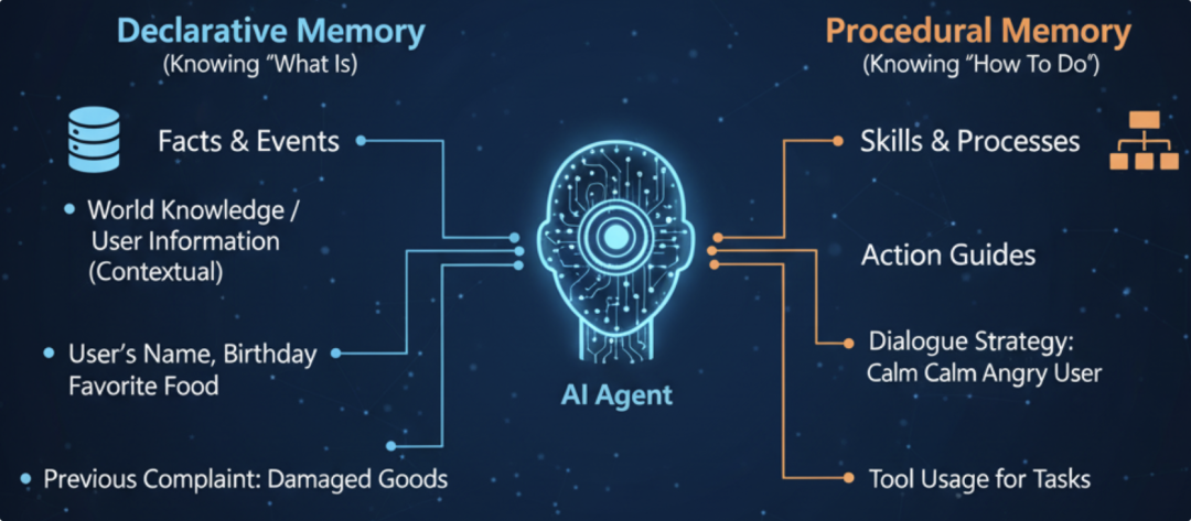 人类记忆可分为陈述性记忆(知道“是什么”)和程序性记忆(知道“怎么做”)。类似地,AI Agent的长期记忆也可大致分成这两类:
