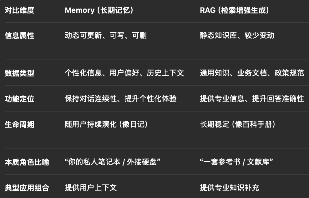 Memory 更像一本随时可写、可删、可更新的“笔记本”或“硬盘”;而 RAG 更像一套结构稳定、更新不那么频繁的“参考书体系”。