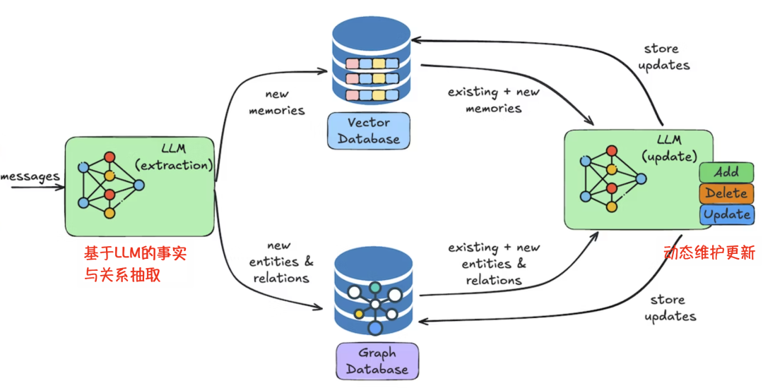 根据检测结果,Mem0决定是添加新记忆,还是更新或者删除旧记忆