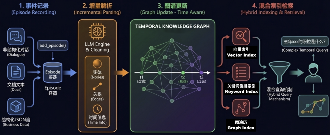 Graphiti引入时间知识图谱的概念,专门为AI Agent设计:它能够将对话内容(非结构化)和业务数据(结构化)纳入同一图谱,不断增量更新,并保留历史演化关系。其工作流程描述为:
