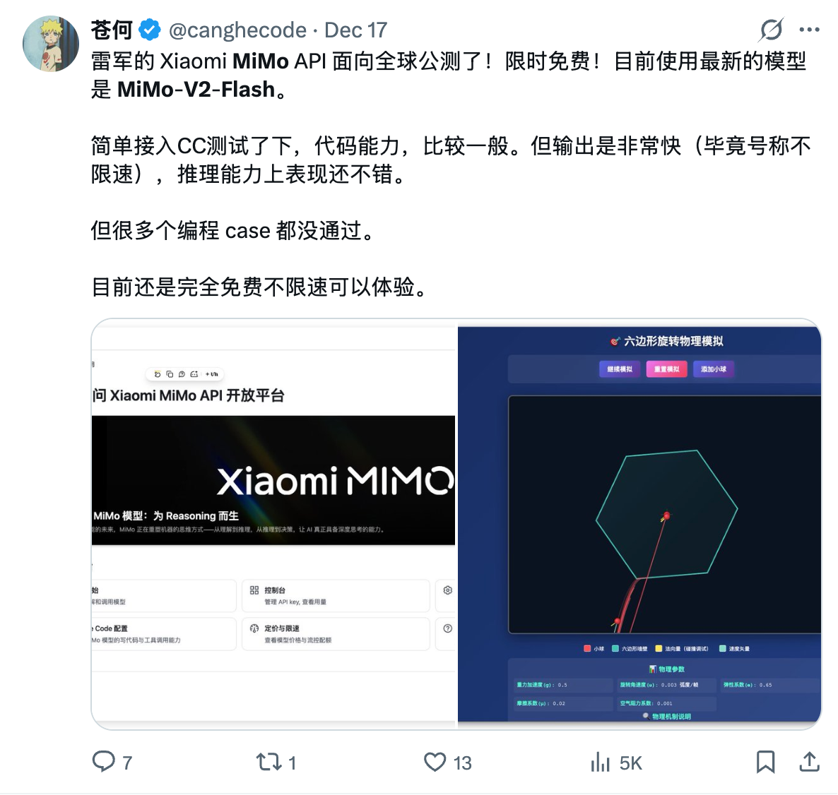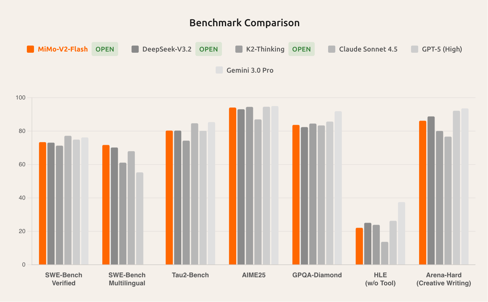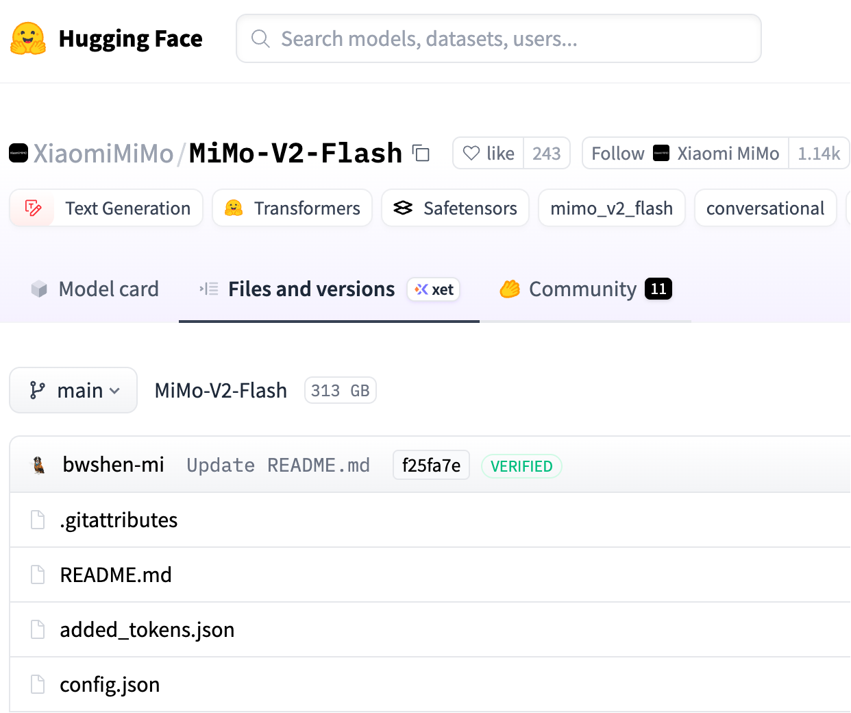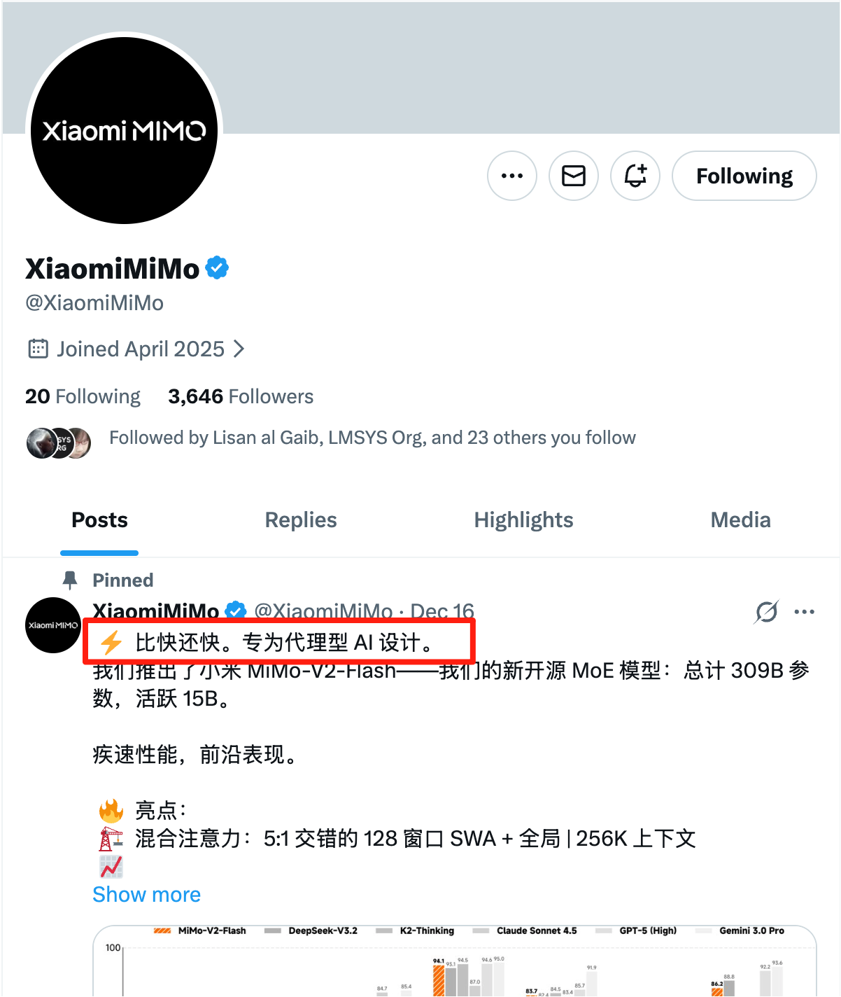 🤗 模型权重:http://hf.co/XiaomiMiMo/MiMo-V2-Flash 📝 博客文章:http://mimo.xiaomi.com/blog/mimo-v2-flash 📄 技术报告:http://github.com/XiaomiMiMo/MiMo-V2-Flash/blob/main/paper.pdf 🎨 AI 工坊:http://aistudio.xiaomimimo.com
