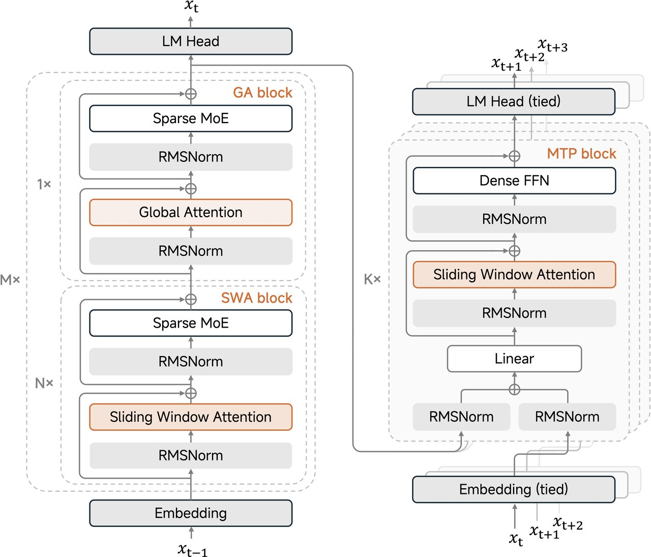 → 使用混合注意力:滑动窗口 + 全局,比例为 5:1 → 8 混合块(5 个滑动窗口注意力层 → 1 个全局) → 128 个标记滑动窗口 → 256 位专家,每令牌 8 位活跃专家 → 原生训练 32K, 扩展到支持 256K 上下文