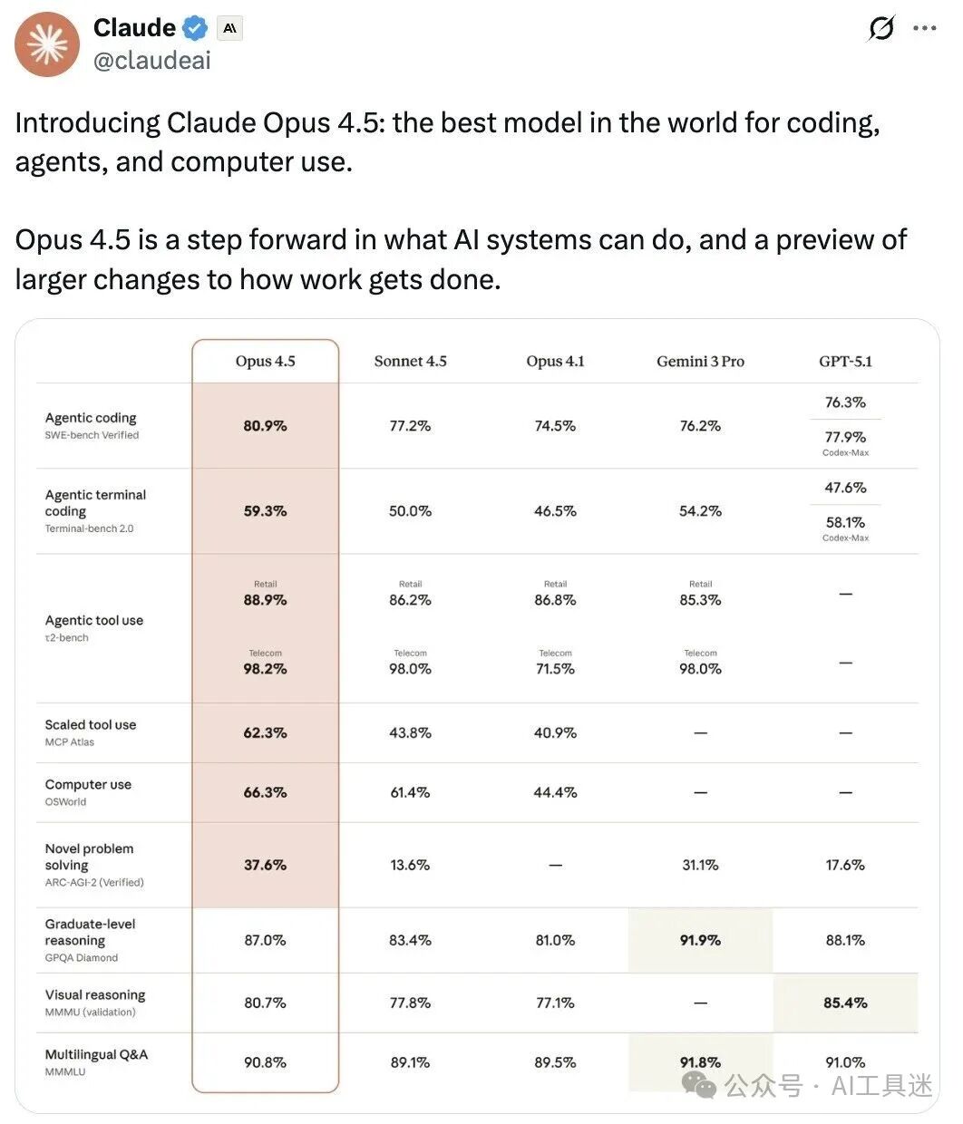 最后,我这里做一个测试分享,横向对比一下Claude Sonnet 4、Claude Opus 4.5的测评数据