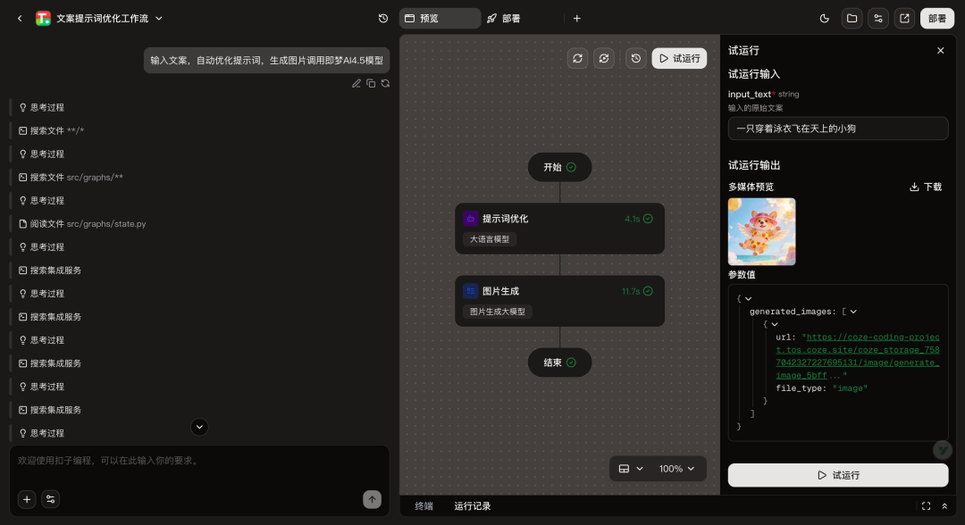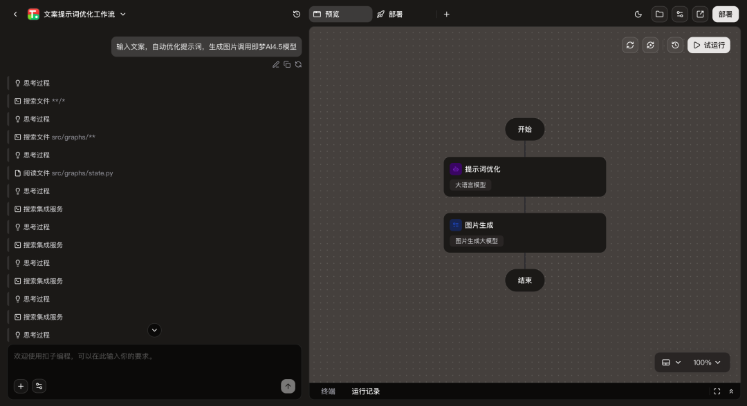 输入需求:“输入文案,自动优化提示词,生成图片调用即梦AI4.5模型”