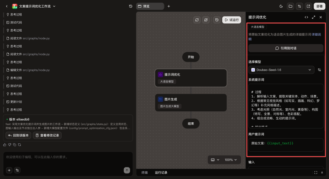 它就自动生成了一个工作,你可以选中某个具体的节点,比如大模型节点,可以看到提示词以及切换大模型