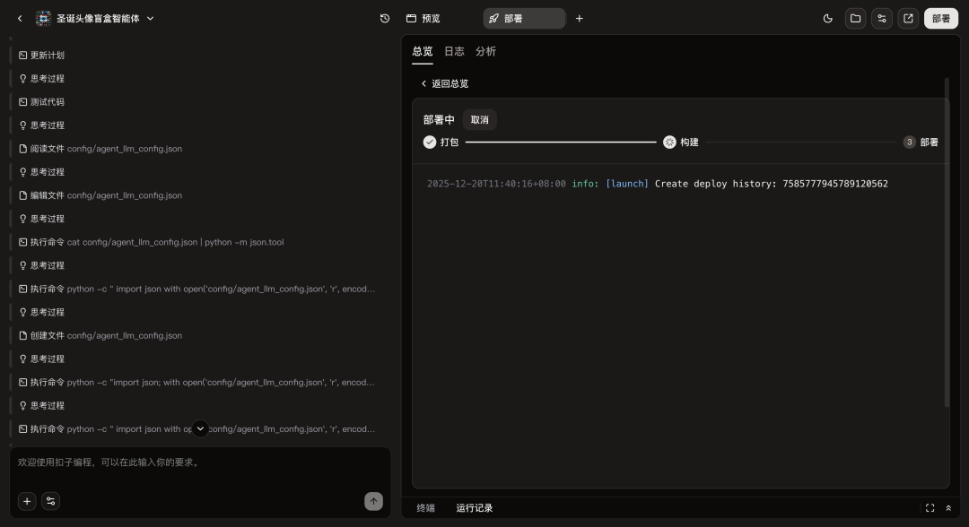 上周扣子编程重磅发布,我们团队在第一时间接入了扣子编程的AI智能体的API,详细请看《扣子编程:一句话生成AI智能体发布到小程序 》。