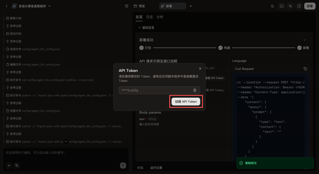 粘贴刚才复制的API TOKEN,然后在到扣子编程复制Curl Request