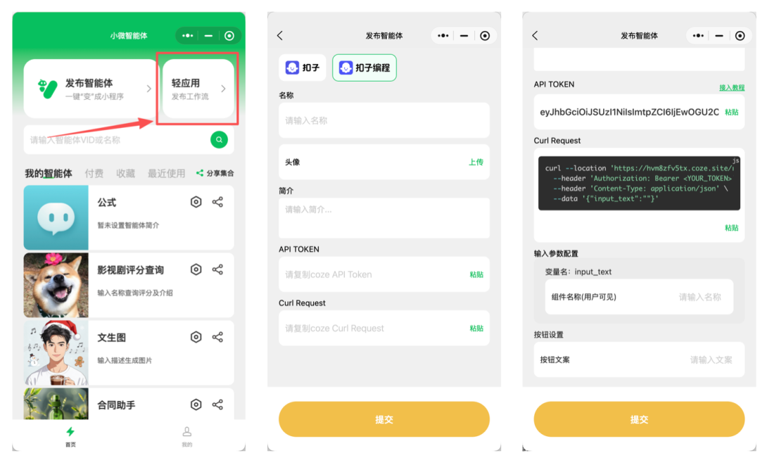 选择发布轻应用-选择扣子编程,输入名称、上传头像、输入介绍