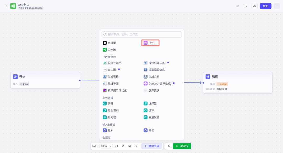 使用方式:在工作流或者智能体编辑页面选择添加插件。