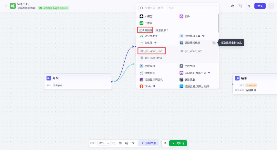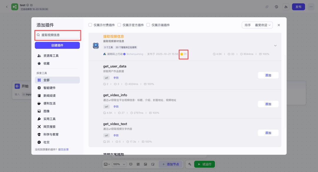 根据自身需求进行添加相关插件,我先添加一个 get_video_info(获取视频信息)工具。