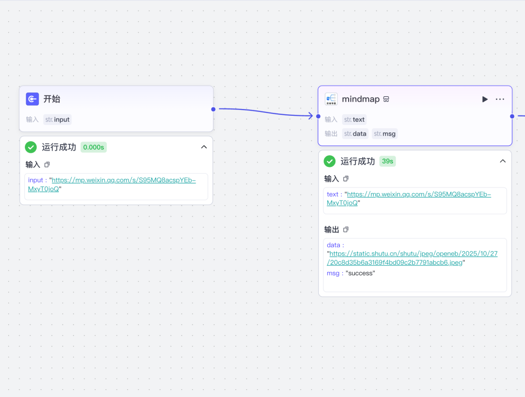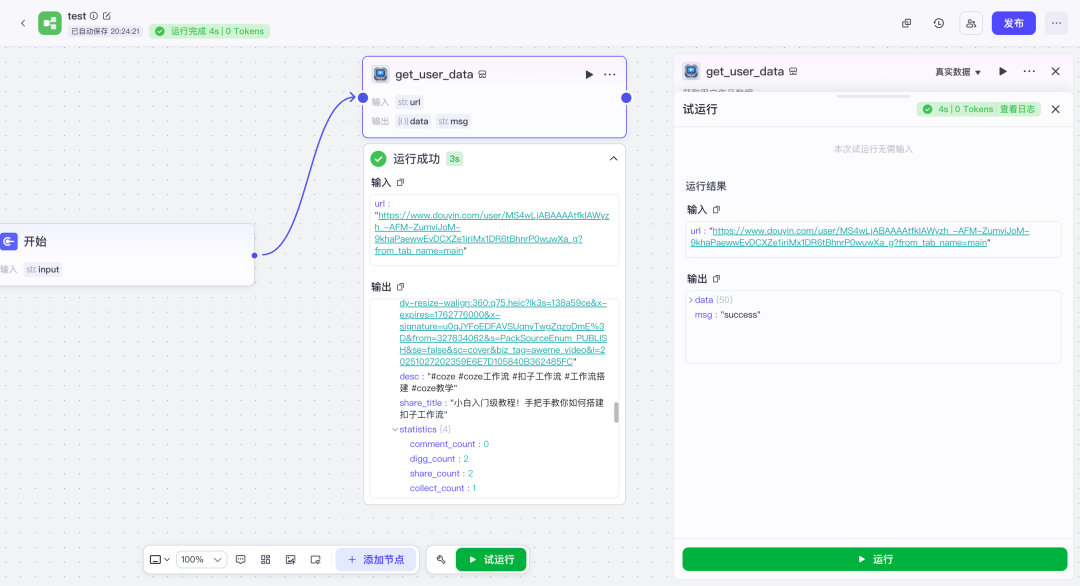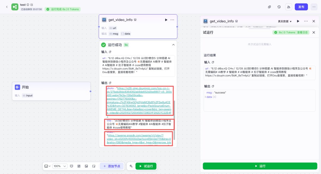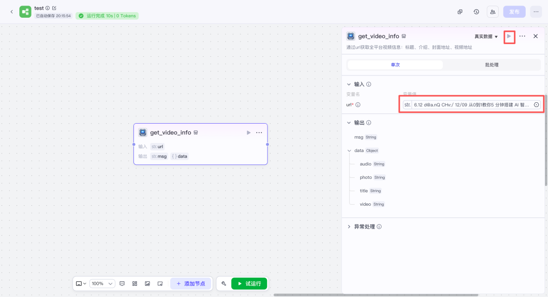 然后将复制的链接填写到url变量值中,点击右上角的运行图标,在工作流的插件节点中测试运行