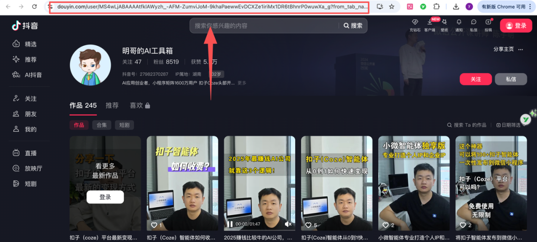 在插件中输入账号主页链接,即可可以获取最近50条作品数据,便于你快速分析账号信息。