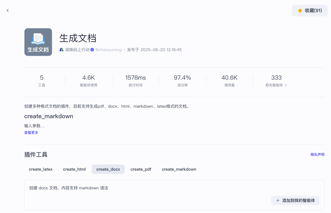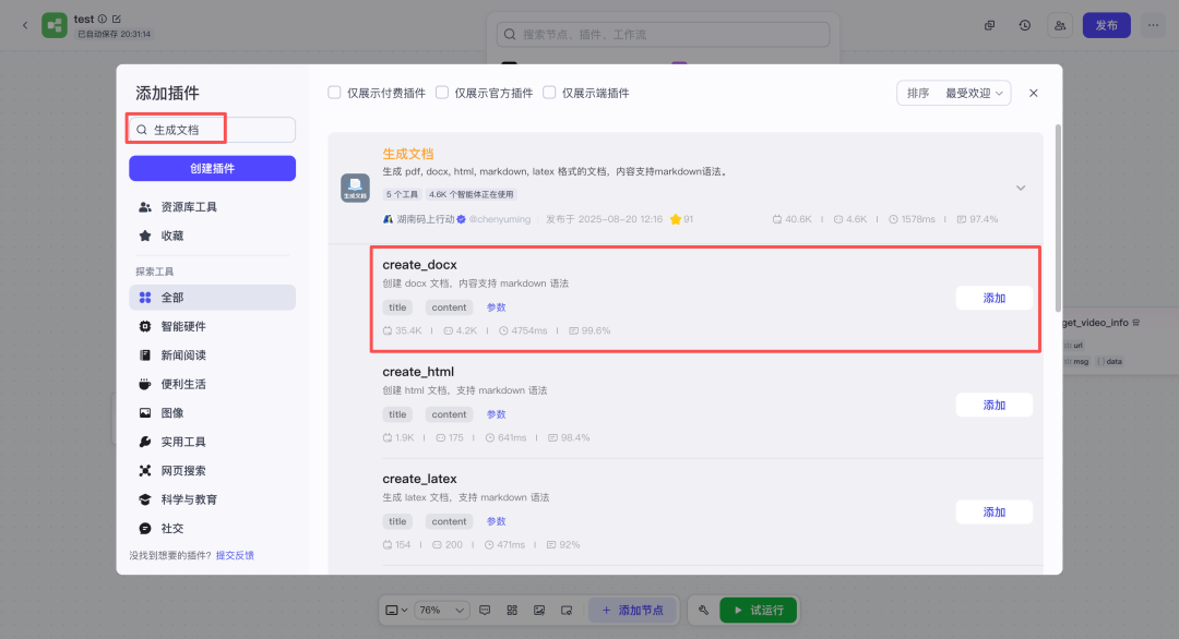 进入插件列表搜索【生成文档】选择 create_docx 工具。