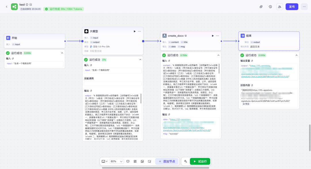 比如我做一个简单的工作流,让大模型节点生成一个租房合同然后生成文档,我们看下它的最终效果。