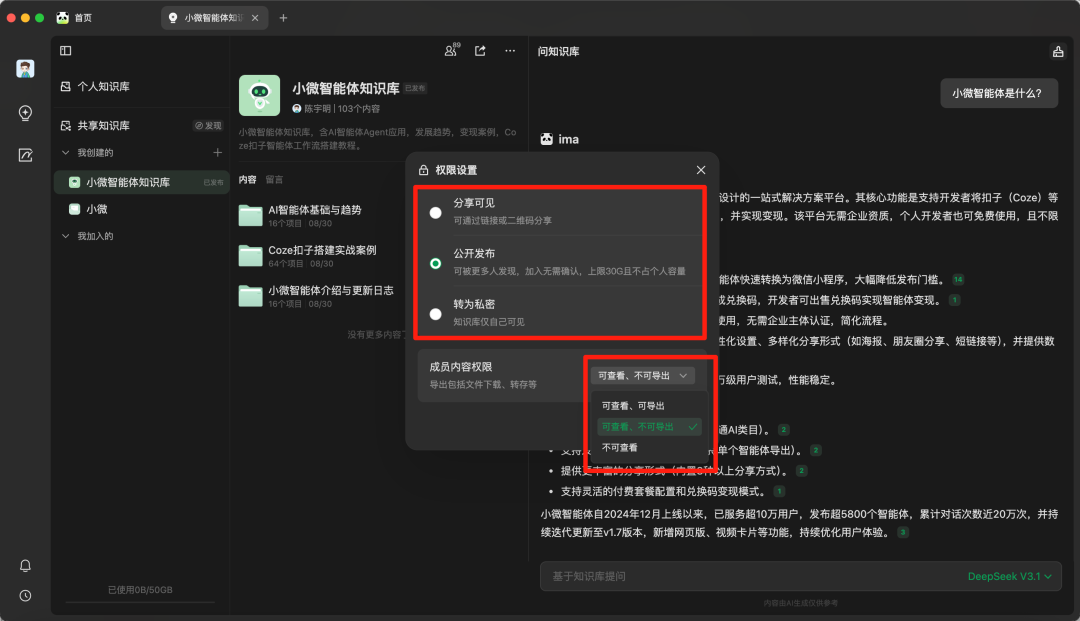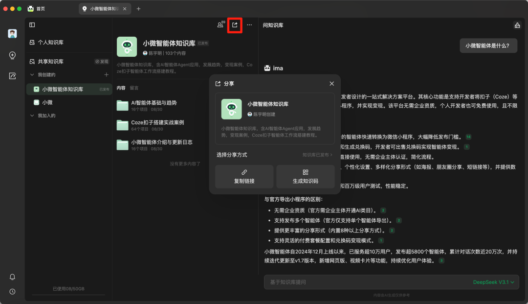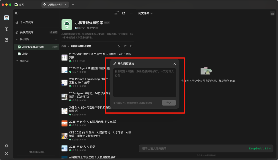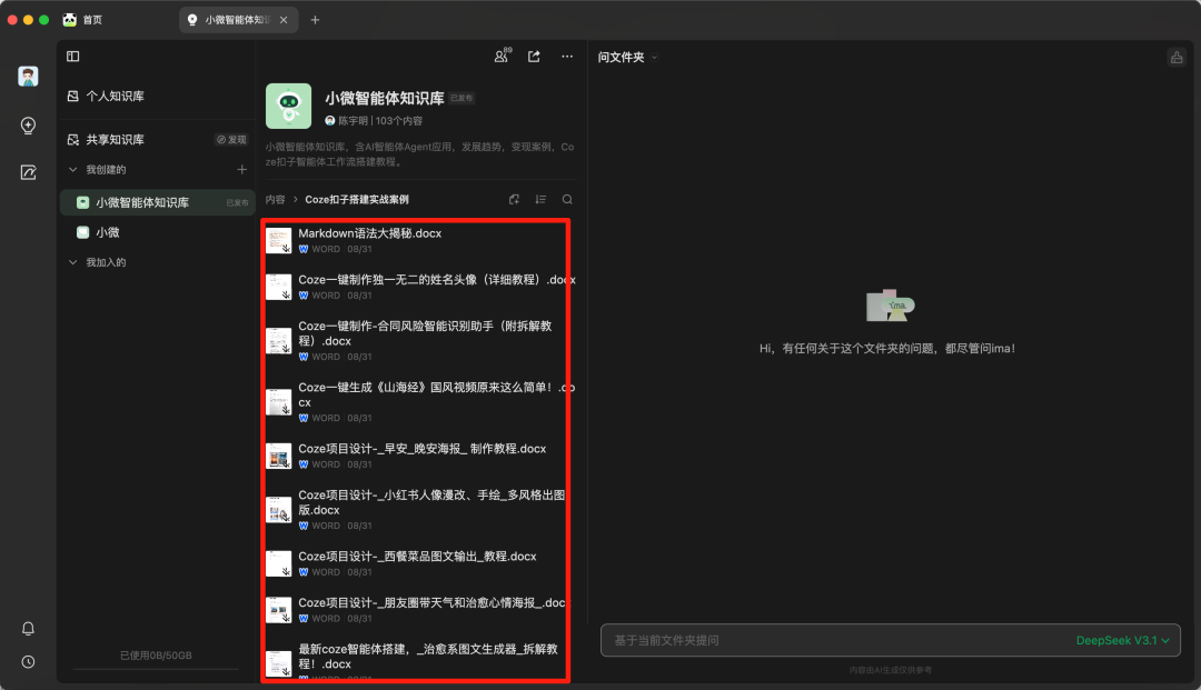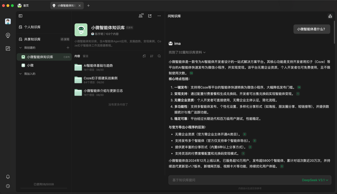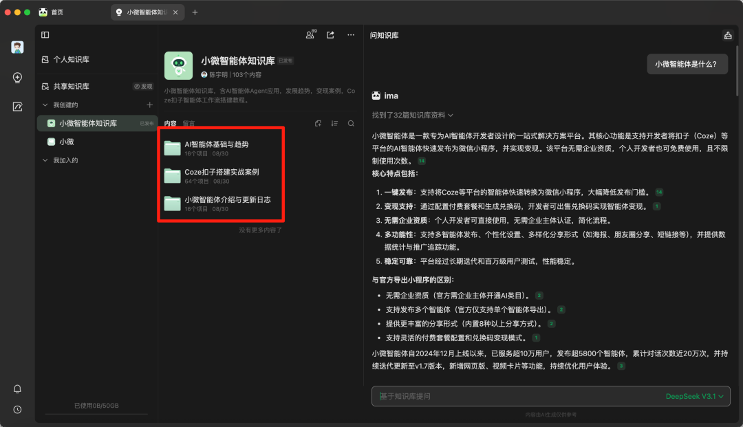 虽然做了AI智能体社群、飞书知识库、直播教学但是还是没有解决我最开始的问题,用户提出重复问题还需要重复回答,所以我最近就用ima搭建了一个公开知识库,内置了100多篇AI智能体干货包含的内容:AI智能体基础与趋势、Coze扣子智能体搭建实战案例、小微智能体的介绍与更新日志。