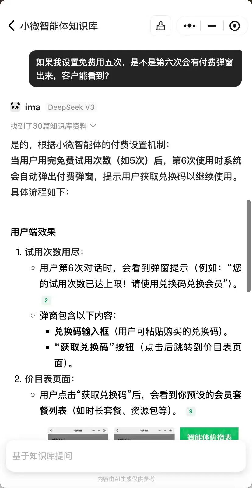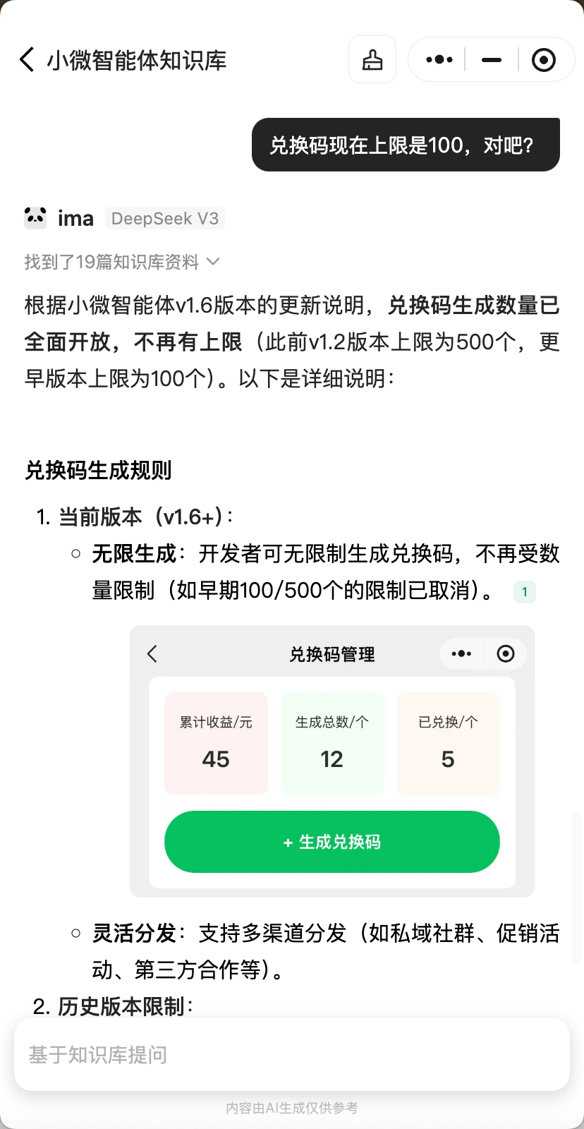 因为知识库里面有小微智能体所有的版本迭代信息,所以它回答了之前是有限制的,但是在v1.6版本兑换码已经没有限制了。