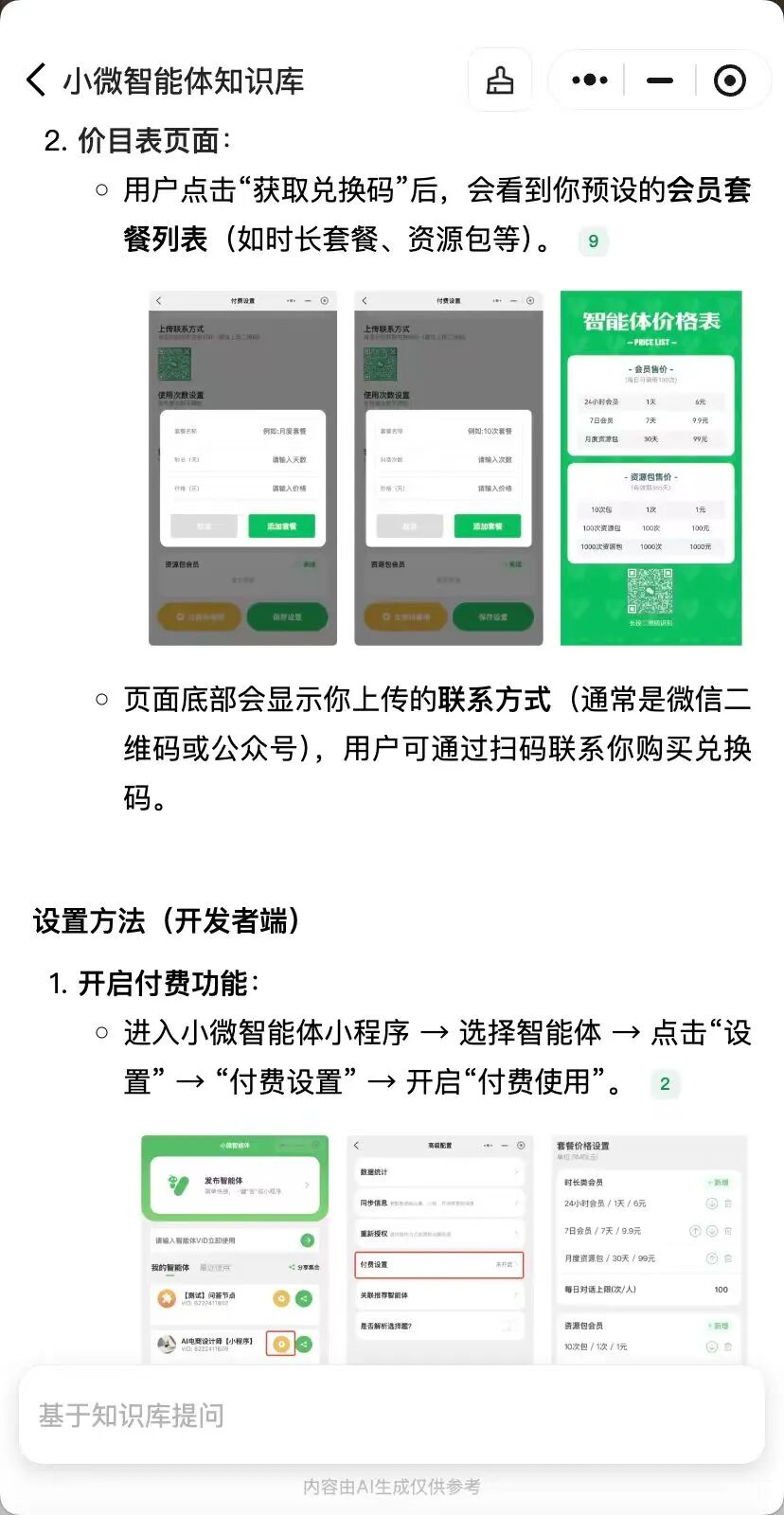 第一个问题:这个用户问的是小微智能体里面的付费设置功能的问题。