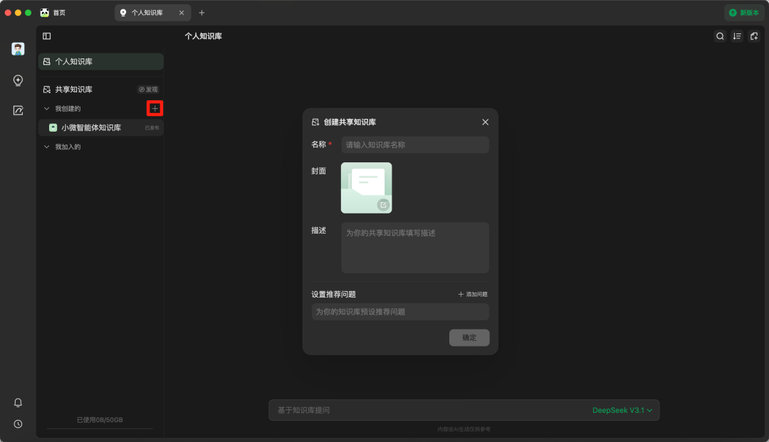 然后在我创建的旁边有一个+号,创建一个共享知识库,输入名称(必填)、上传封面、填写描述、推荐问题。
