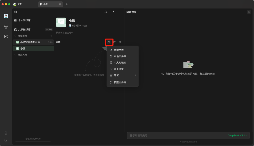 在内容的旁边有个+号,支持本地文件、本地文件夹、个人知识库、网页链接、笔记。