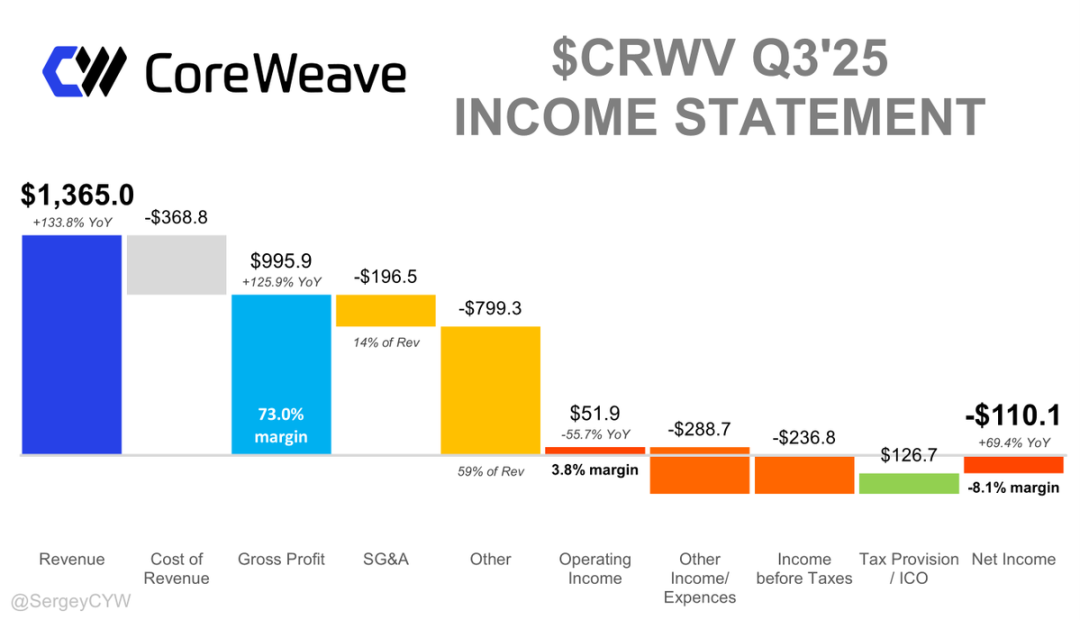 财务数据呈现典型的成长期特征。2025年第三季度营收13.65亿美元,同比增长134%。毛利率约73%,调整后EBITDA利润率61%,说明一旦规模上去,赚钱能力很强。