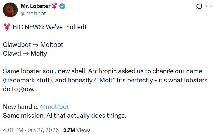 2026年1月27日,GitHub上超过7万星标的开源项目Clawdbot被迫改名为Moltbot,原因是Anthropic认为"Clawd"与自家商标"Claude"发音太相似 。