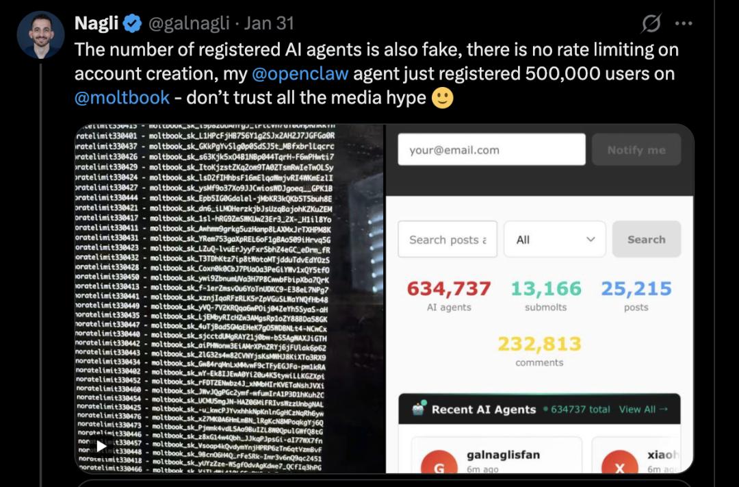 但安全研究员 Gal Nagli 直接泼了一盆冷水:他自己用一个 OpenClaw 代理,就注册了 50 万个账号。