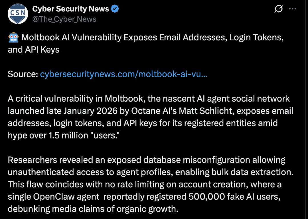 更严重的问题来了:Moltbook 存在重大安全漏洞。