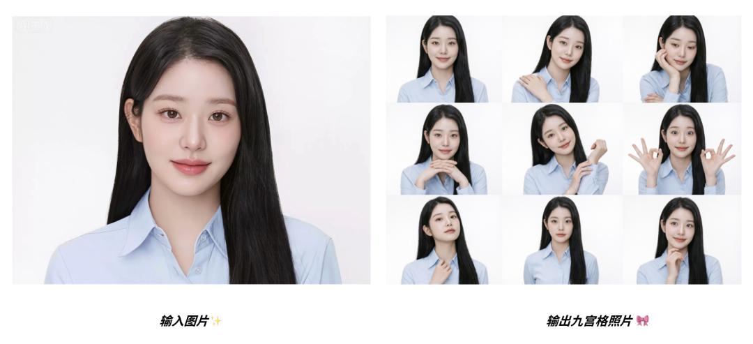 九宫格多姿势自拍:上传一张照片,模型生成九宫格组图,每格换一个拍照姿势和角度,效果统一、风格连贯。