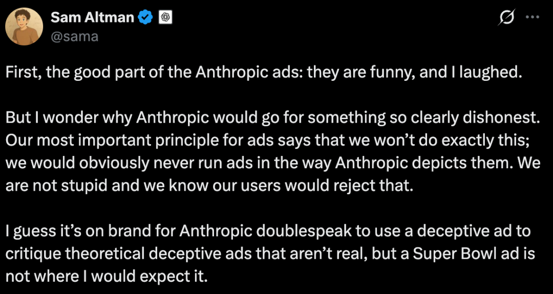 广告播出后,OpenAI CEO Sam Altman 在 X 上发文回击,说这则广告明显不诚实,OpenAI 显然不会以 Anthropic 描述的方式投放广告,而且 Anthropic 是想控制人们如何使用 AI,同时向有钱人出售昂贵的产品。