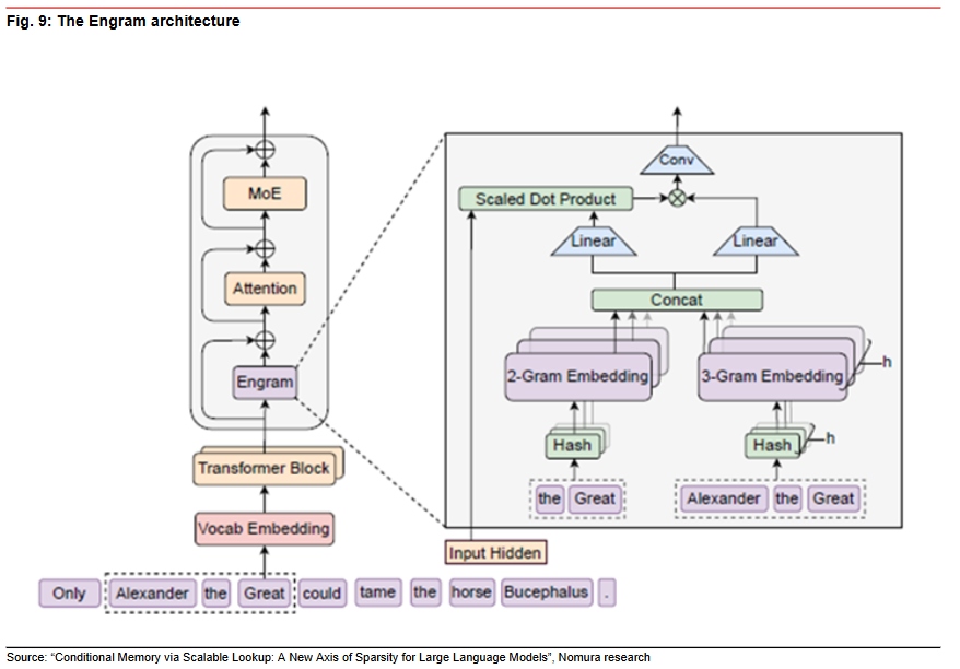 而野村证券在 2 月 10 日发布的研报中指出,V4 不会像去年的 V3 那样引发全球 AI 算力需求恐慌,但它可能通过两项底层架构创新——mHC 和 Engram 技术——进一步降低训练和推理成本,加速中国 AI 价值链创新周期。