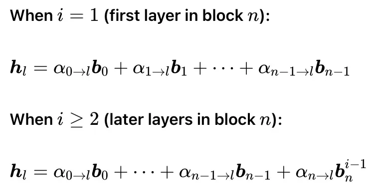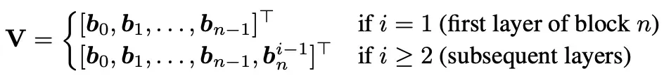 块间注意力的具体表现是:块内每一层计算输入的时候,需要查询「原始输入」、「已完成的历史块的聚合结果」和截止当前的「累加和」,对这几部分内容作注意力加权计算。用于当前层输入隐状态计算的V矩阵的定义如下,q、k及注意力权重公式完成参照全注意力残差模式中的定义: