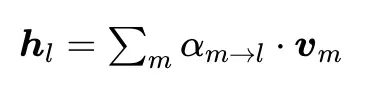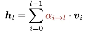 为了解决标准残差每层贡献权重均等带来的问题,本文提出了「全注意力残差」的机制,即把每层的贡献添加权重,让更重要的层具备更强的表示能力。这里依然v代表每一层的变换结果f(h),v0就是原始embedding后的结果用于模型输入,即h1。每一层输入隐状态公式如下:
