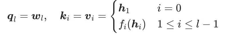 同时,每一层的权重参数是由注意力机制计算得到,最终得到历史所有层对该层的贡献权重softmax值,公式如下: