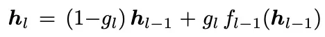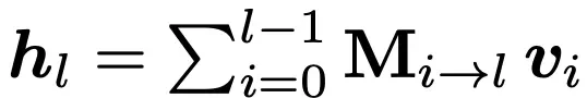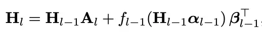 最终,该块内每一层的输入hl的公式推导依然符合如下形式,其中α代表第m模块输出到第l层的贡献权重: