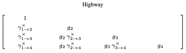 这种机制的特点是把前一层的输入和当前层的变换的两个权重用门控系数控制,我们根据上述公式推导得到M权重矩阵如下:
