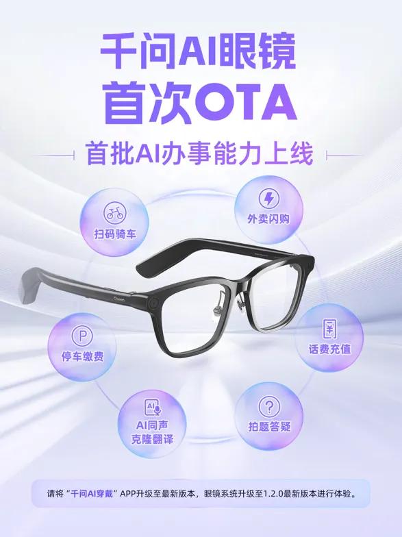 4月2日,千问AI眼镜发布后首次进行OTA升级,上线首批“AI 办事”能力,并且深度接入淘宝闪购、支付宝,支持话费充值、扫码骑车、停车缴费、语音点外卖等高频生活服务。