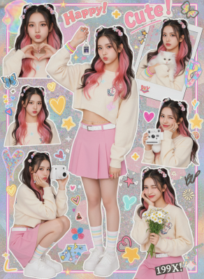 主体为女性,重点突出眼睛、鼻子、嘴唇三大核心特征,表情兼具微笑、可爱、清新、梦幻与略带性感的特质,她坐在白色桌子旁,双手托腮并微微侧身,一头直发梳成大发髻,搭配与服装相配的蝴蝶结,毛发柔软且层次分明,有自然垂落在脸上的发丝,在微风吹拂下轻轻飘动,脸颊和鼻子带有自然红晕,嘴唇丰满且呈现柔和的粉桃色调。服装、鞋子和包均与参考照片完全匹配,配饰方面佩戴细金项链(饰有交替的爱心、新月形及 Gucci 吊坠)、精致的 Gucci 吊坠手镯、金戒指、钢带百达翡丽手表以及古驰小金耳环。